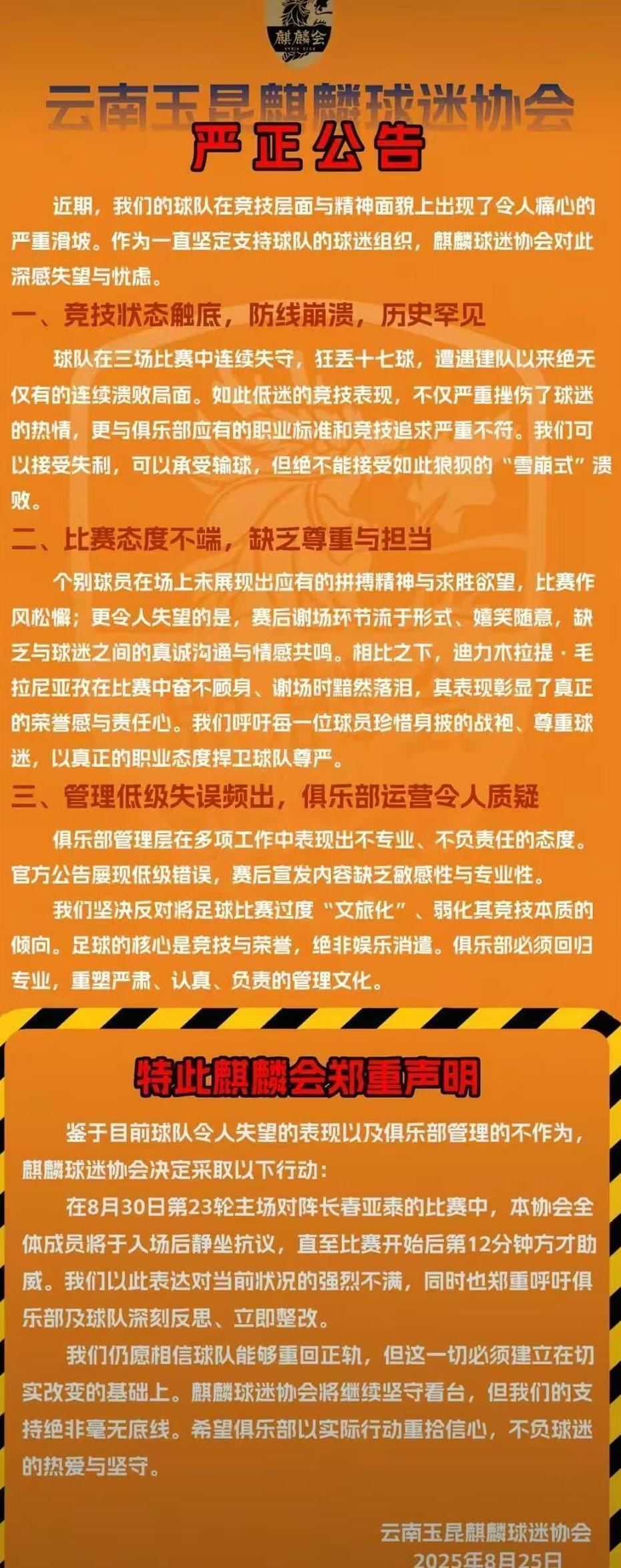 北京时间8月26日,中超升班马云南玉昆俱乐部知名球迷组织“麒麟球迷协会”发表声明,因为俱乐部近期战绩严重滑坡,该球迷会成员将在下轮主场对阵亚泰的比赛中,入场后静坐抗议,比赛第12分钟后开始助威。